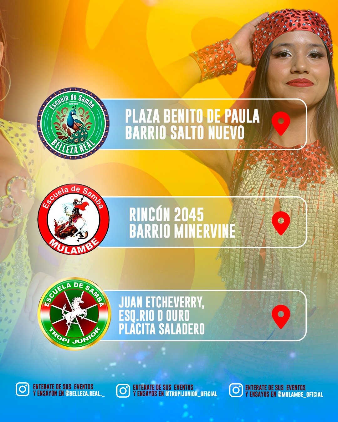 Los lugares de ensayo de las escuelas de samba de Salto son: Mulambé en Rincón 2045, barrio Minervine; Belleza Real en Plaza Benito de Paula barrio Salto Nuevo, Tropi Junior en Juan Etcheverry esquina Río D’Ouro, barrio Saladero; Barrio Ceibal en la Plaza Estigarribia en Ceibal, Unidos de la Zona Sur en Rodó y Guaraní, en la Zona Este y La Estrella en Cervantes y Cerrito en el club Lazareto.